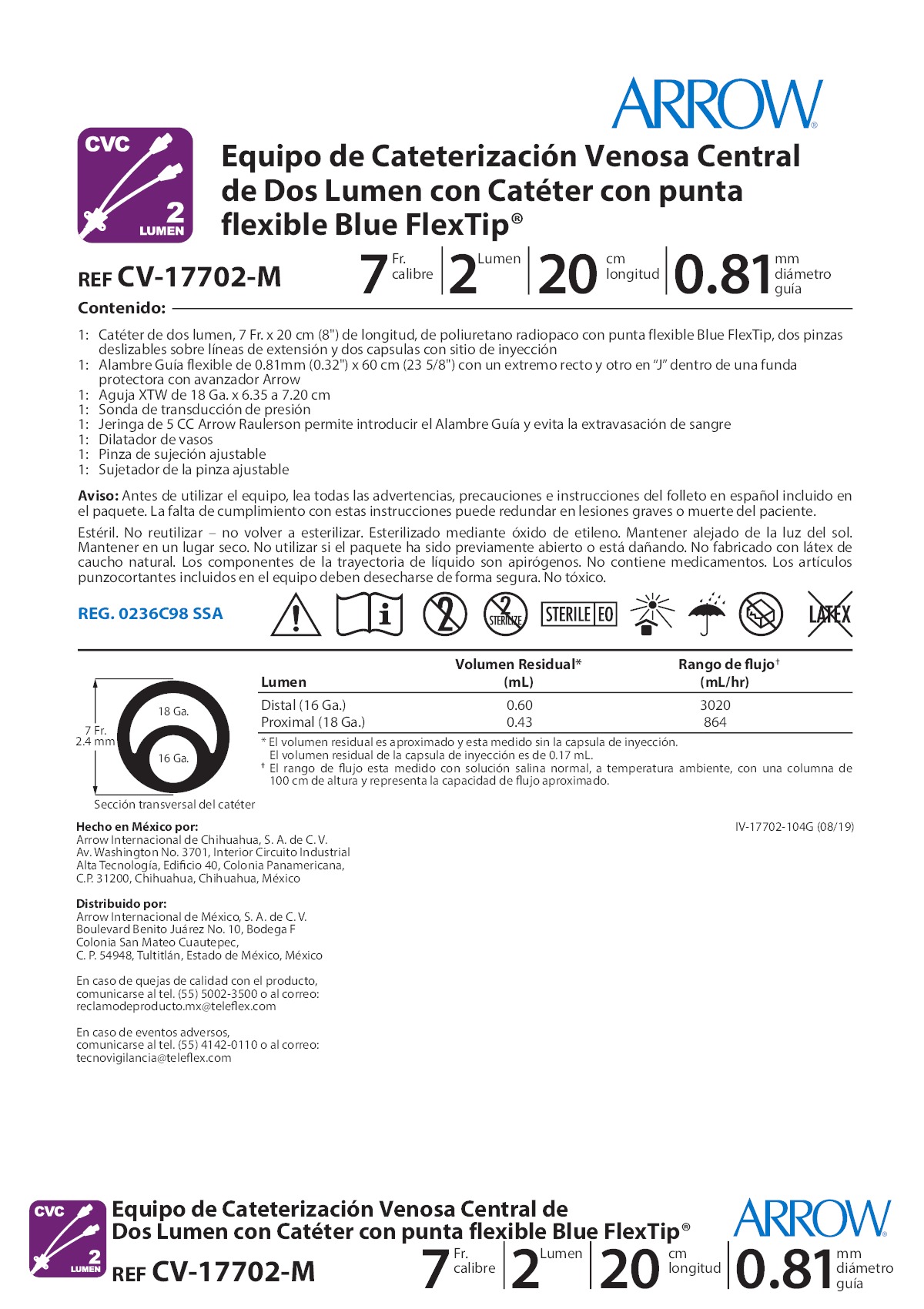 CATETER VENOSO CENTRAL 7FR 2 VIAS ARROW cantidad